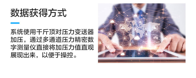 數(shù)據(jù)獲得方式:系統(tǒng)使用千斤頂對(duì)壓力變送器加壓,通過(guò)多通道壓力精密數(shù)字測(cè)量?jī)x直接將加壓力值直觀展現(xiàn)出來(lái),以便于操控。