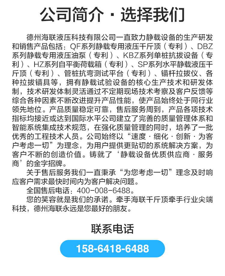 加壓系統(tǒng):設(shè)備采用本公司靜載試驗(yàn)千斤頂,配套靜載試驗(yàn)油泵,壓力調(diào)節(jié)輕松易控。